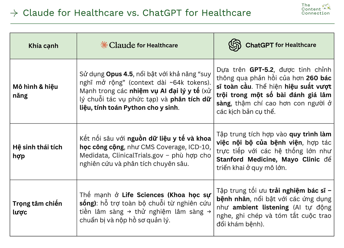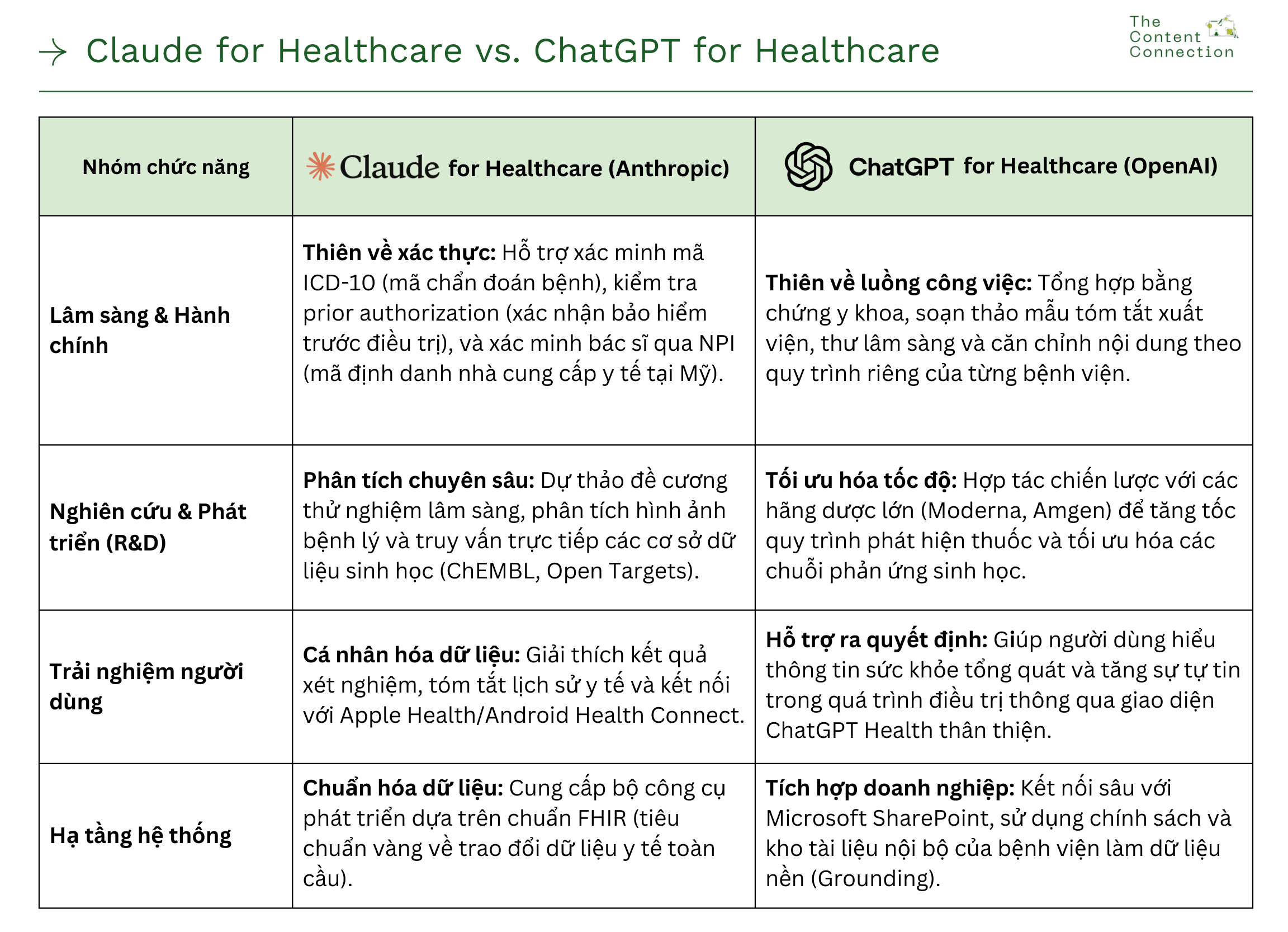 1.2 So sánh chức năng: Claude for Healthcare vs. ChatGPT for Healthcare